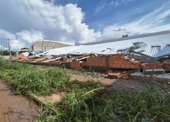 Ventos fortes derrubaram um barracão, hoje, na avenida André Maggi, região do bairro Jardim Conquista. Parte da estrutura cedeu, quebrando…