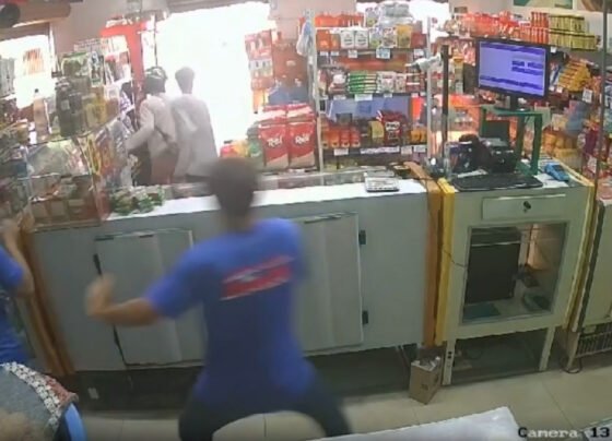 Reprodução Uma câmera de monitoramento registrou o momento em que dois criminosos armados entram em uma mercearia de Rondonópolis (216…