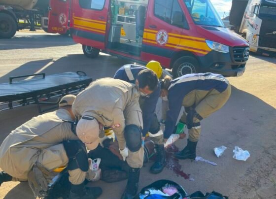 Mulher quase tem perna decepada em acidente entre moto e carreta em Lucas do Rio Verde