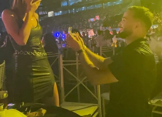 Reprodução O bombeiro civil Euluan Gabriel pediu a namorada Tamia Santos em casamento no show do cantor sertanejo, Gusttavo Lima,…