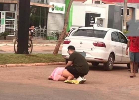 Mulher fica ao perder o controle e bater bicicleta em carro