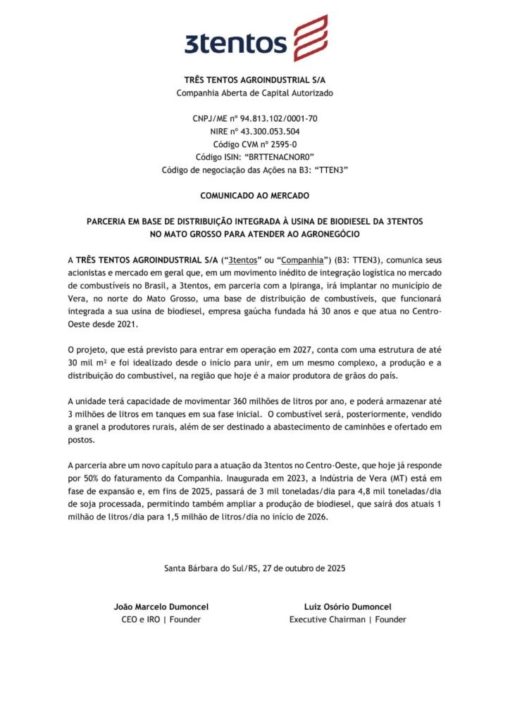 Uma parceria estratégica promete transformar a logística de combustíveis no coração do agronegócio brasileiro. A 3tentos e a Ipiranga firmaram acordo para a implantação de uma base de distribuição de combustíveis integrada à usina de biodiesel da 3tentos, em Vera (MT). O anúncio foi feito oficialmente pela empresa gaúcha em comunicado ao mercado divulgado nesta segunda-feira (27).
