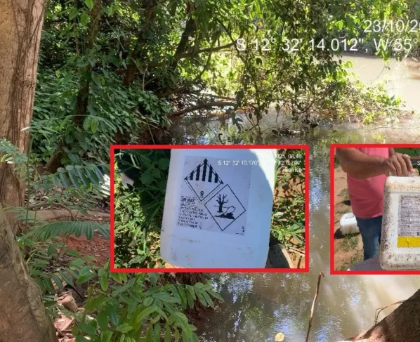 Além da contaminação líquida, foram encontradas em uma residência próxima diversas embalagens de defensivos agrícolas descartadas irregularmente, expostas a céu aberto e exalando forte odor característico de produtos químicos.
