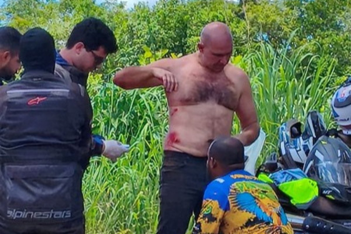 Pela imagem é possível ver o prefeito sendo ajudado por outros motociclistas logo após a queda. Ele está sem camisa e apresenta alguns ferimentos na lateral do corpo e no braço.