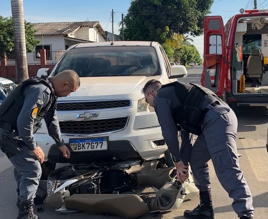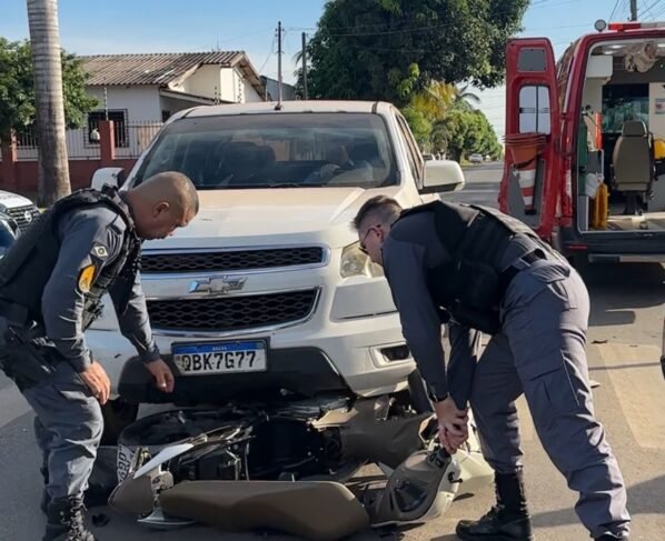 Na manhã desta quinta-feira (20), um acidente de trânsito foi registrado no cruzamento da Rua Cruz Alta com a Avenida Mangabeira, em Lucas do Rio Verde. A colisão envolveu uma caminhonete Chevrolet S10 e uma motocicleta Honda Biz.