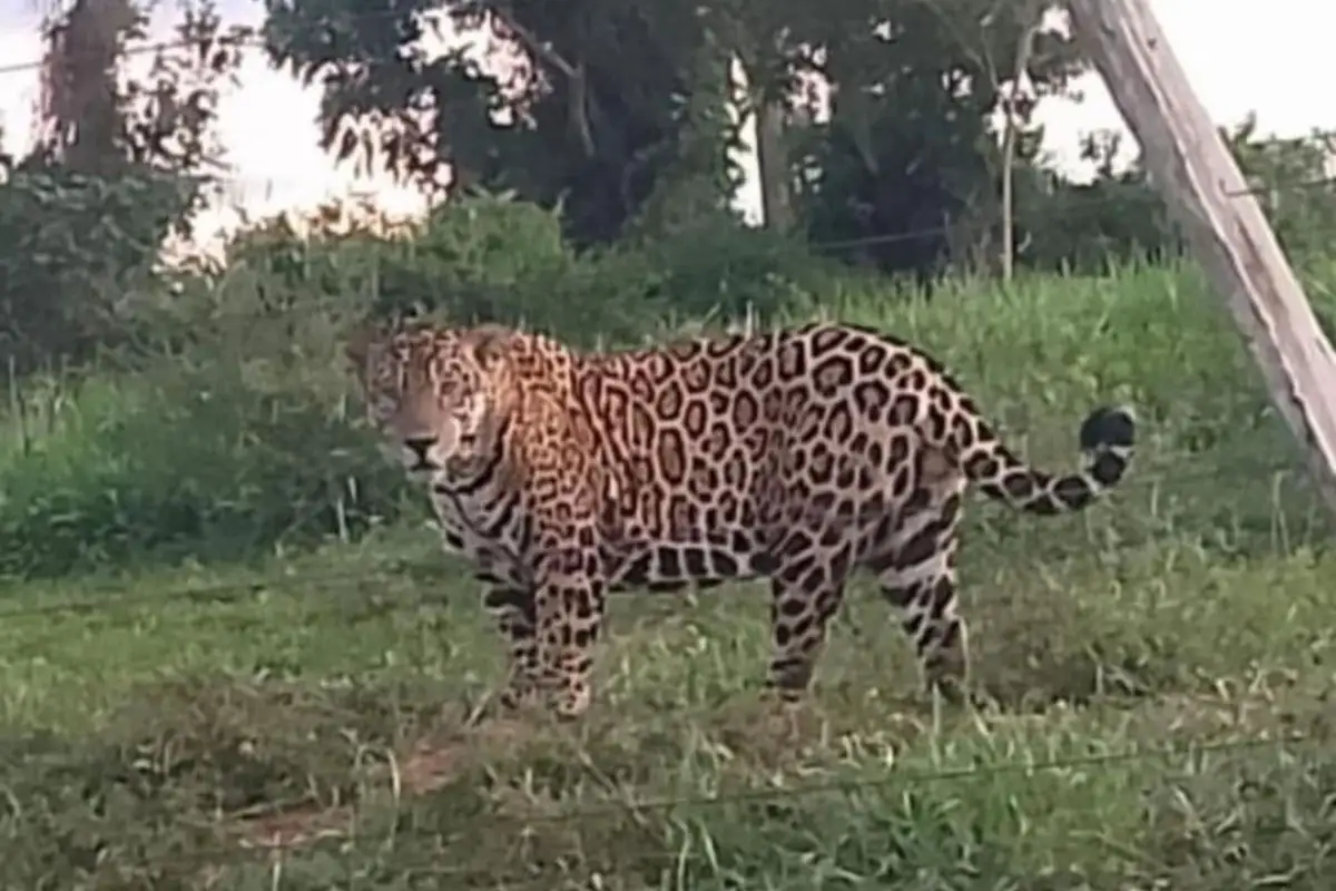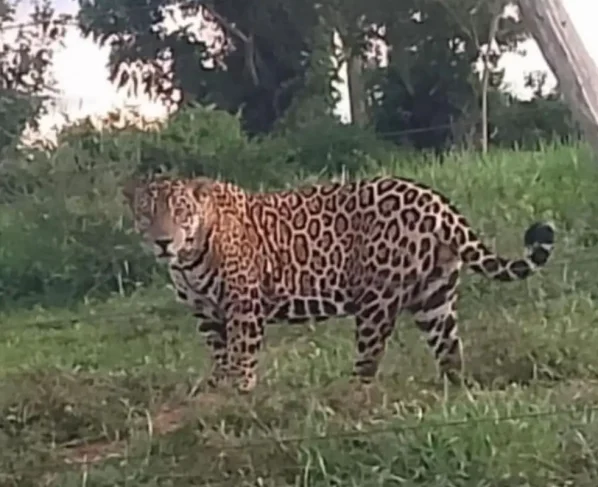 Uma onça-pintada imensa, de vez em quando, acompanha o movimento pela propriedade. O registro mais recente feito por Estevão mostra o animal posando para a foto em um dia de rotina normal na fazenda.