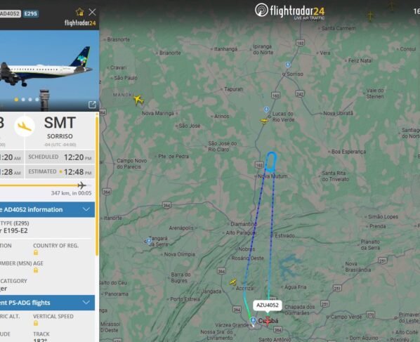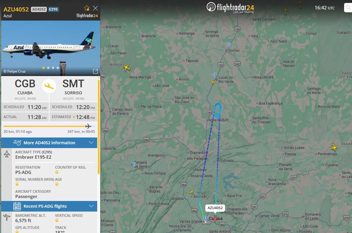 O voo Azul 4052, que saiu de Cuiabá com destino a Sorriso na tarde desta terça-feira (25), precisou retornar à capital devido às condições meteorológicas severas na região. A aeronave, um Embraer 195, chegou próxima ao município, mas não conseguiu realizar o pouso com segurança diante da baixa visibilidade e da intensidade das chuvas.