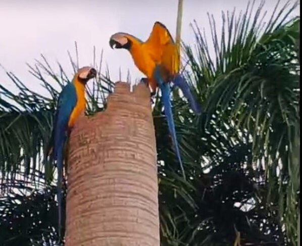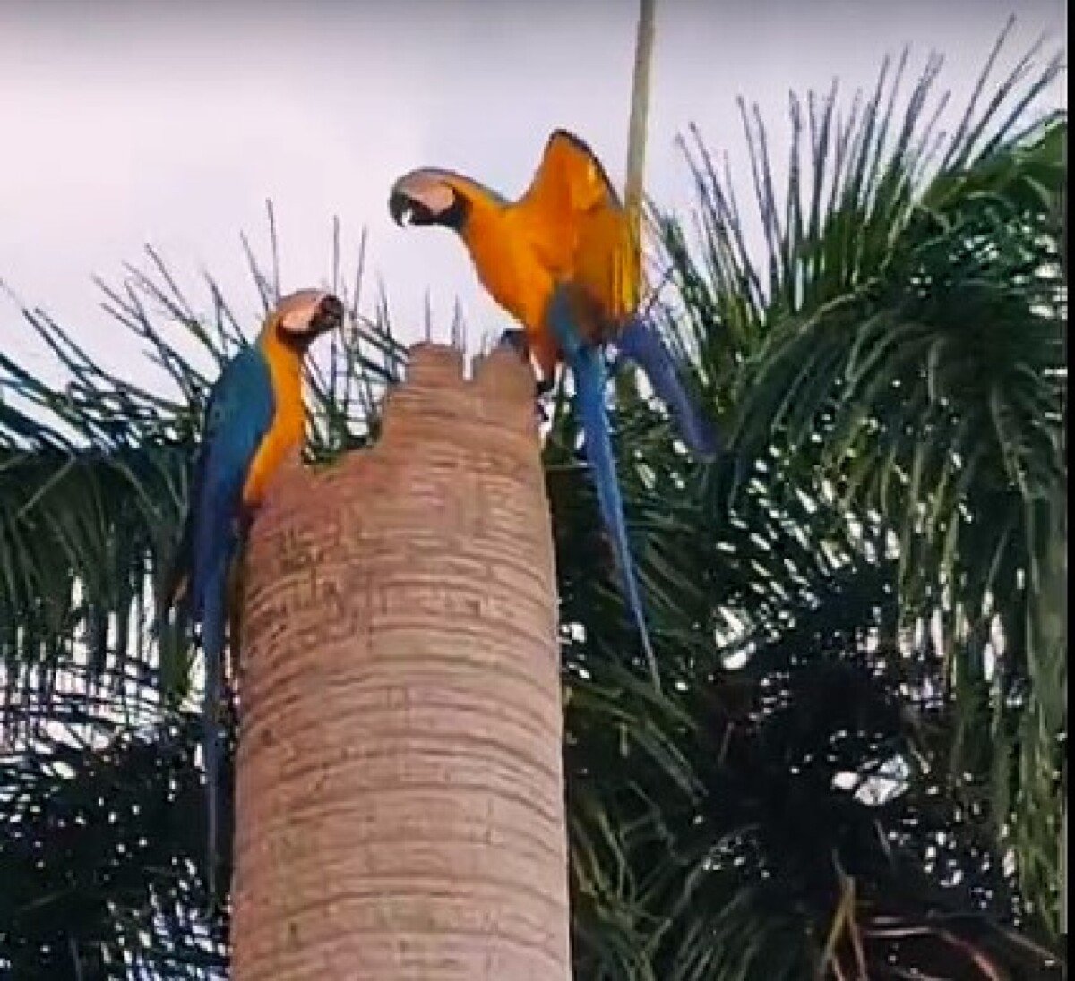 Um casal de araras resolveu fazer um ninho em um local inusitado e foi flagrado por moradores do bairro Dom Aquino, em Cuiabá. O ponto escolhido foi o tronco de uma palmeira na Rua Major Gama, local de muito movimento durante todo o dia.