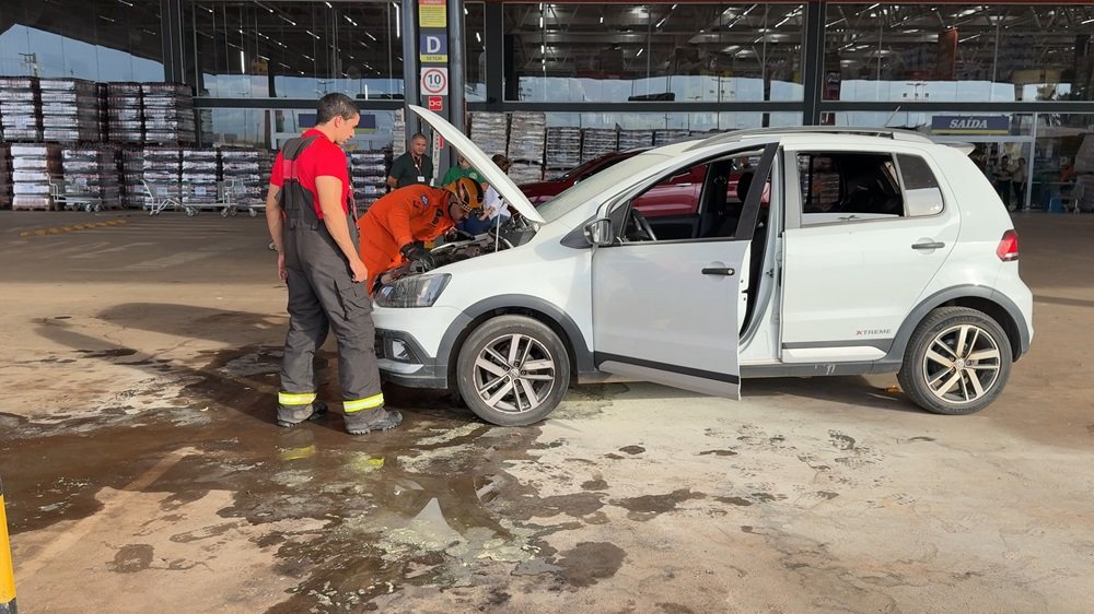 A motorista relatou que havia acabado de chegar ao estabelecimento para fazer compras quando percebeu fumaça saindo da parte dianteira do carro. Ela estacionou e acionou o Corpo de Bombeiros imediatamente.