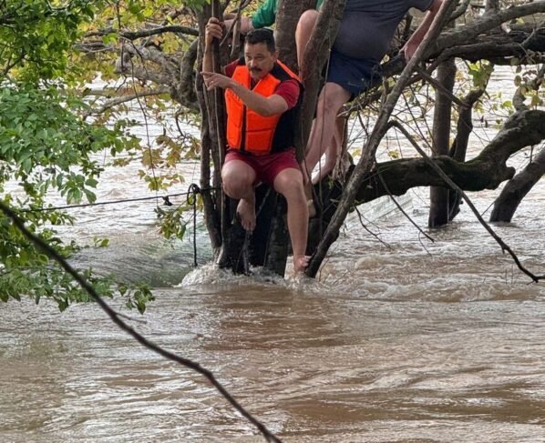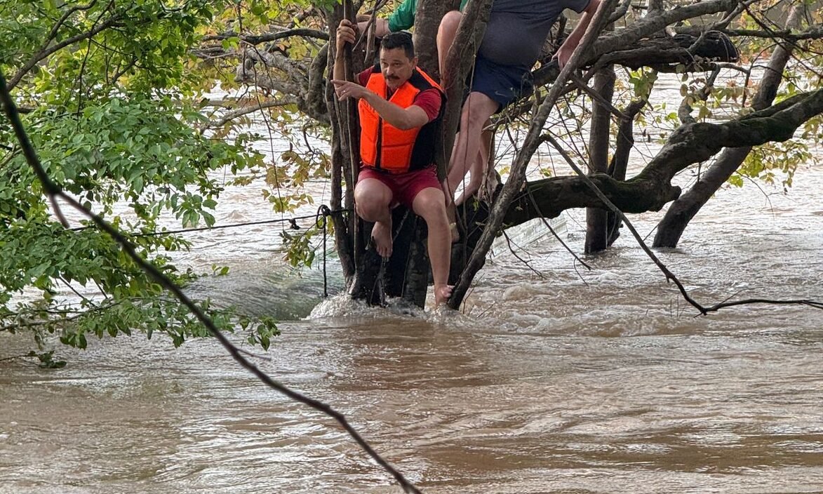 As vítimas estavam em uma árvore, apoiando os pés em um barco, quando os bombeiros chegaram ao local. Inicialmente, tentaram passar um cabo para o outro lado do rio, mas a correnteza impediu a operação. A equipe optou então por utilizar um jetski para o resgate. “Optamos por utilizar o jetski, que tem uma particularidade que é a gente não conseguir ficar parado. Não é simplesmente a pessoa subir. Então, um militar ficou junto com o pessoal equipando, colocando colete e icebelt, que é uma boia, e assim pegamos as pessoas mais tranquilas”, detalhou o sargento.
