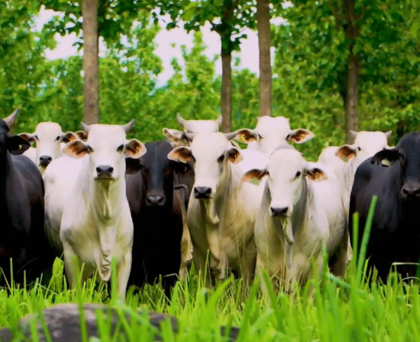 Além da pecuária, a fazenda mantém áreas de teca e mogno-africano desde 2014. O sistema integrado oferece sombra ao gado e gera renda complementar, embora não seja o foco principal do negócio.
