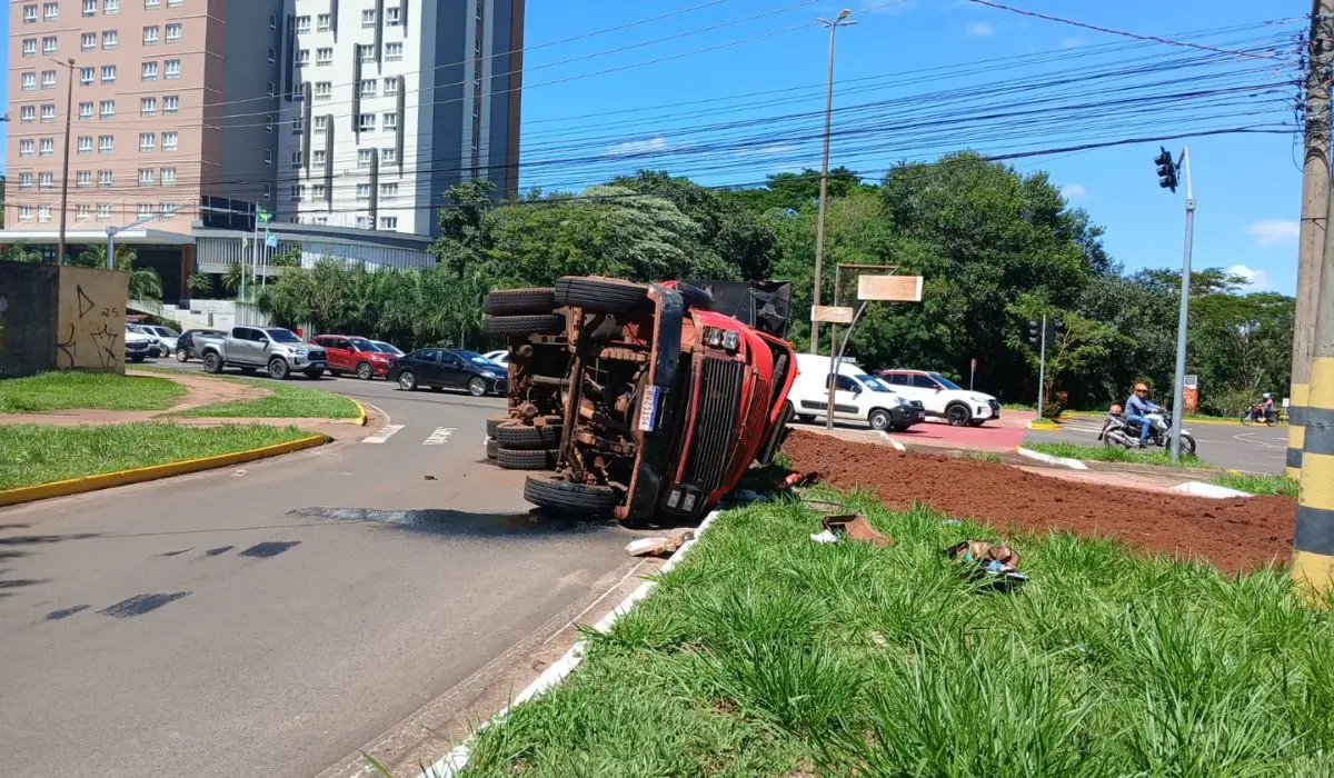 Um caminhão caçamba tombou por volta das 11h30 desta segunda-feira (6) na rotatória que liga a Avenida Mato Grosso à Via Park, em Campo Grande. O veículo seguia no sentido Parque dos Poderes–Centro quando o acidente aconteceu.