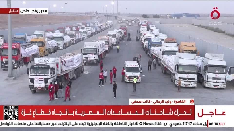 Dezenas de caminhões carregando toneladas de ajuda humanitária se moveram em direção à passagem de Karam Abu Salem, no sul de Gaza, disse o correspondente da Al Qahera na passagem de fronteira de Rafah, entre o Egito e Gaza.