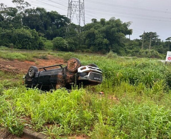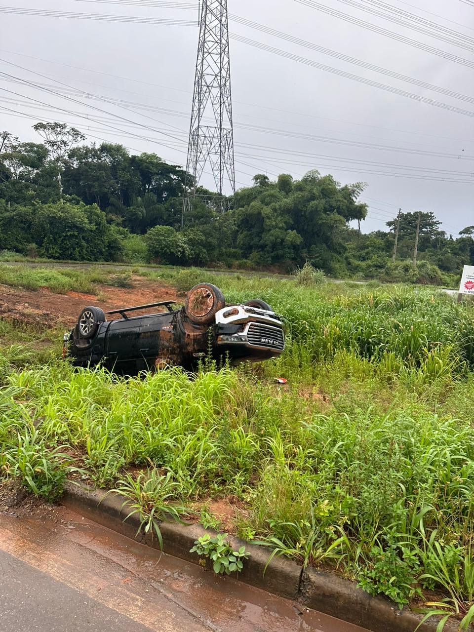 O veículo ficou com as rodas para cima fora da pista, em uma área de vegetação às margens da rotatória. Um guincho também foi acionado para fazer a retirada da caminhonete e liberar completamente o trecho.