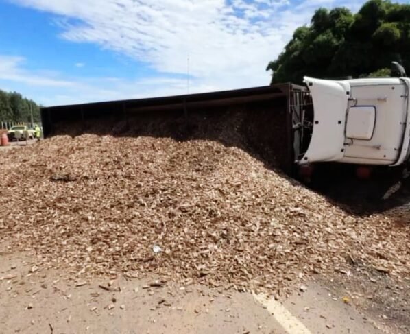 Uma carreta Scania de cor branca tombou no final desta manhã, no trecho da BR-163 em Sinop, na saída para Sorriso, próximo a uma indústria de etanol. O motorista não se feriu.