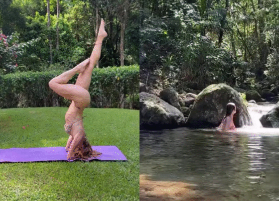 De biquíni, Leticia Spiller pratica ioga em meio à natureza