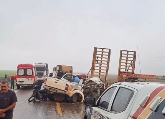 Acidente entre caminhonete e carreta interdita MT-140 no sentido Sorriso