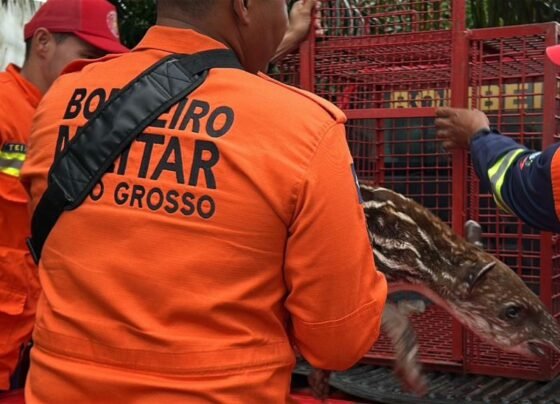 Filhote de anta é resgatado pelos bombeiros após atropelamento da mãe em Sorriso