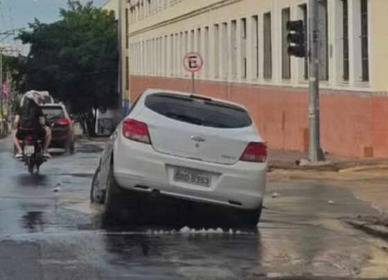 VÍDEO: Buraco engole carro em Cuiabá e expõe, mais uma vez, a incompetência da Águas Cuiabá