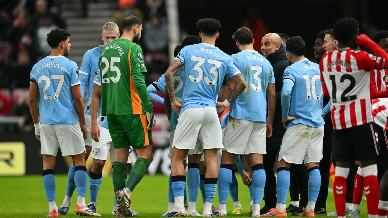 Aos 18 minutos, Brian Brobbey recebeu o lançamento na grande área, ganhou no corpo de Rúben Dias e finalizou para grande defesa de Donnarumma. O City respondeu com Haaland, aos 36 minutos, em chance que o norueguês não costuma perder na área. Trai Hume antes do intervalo, desperdiçou grande chance de cabeça. No total, foi o Sunderland quem finalizou mais vezes na primeira etapa.