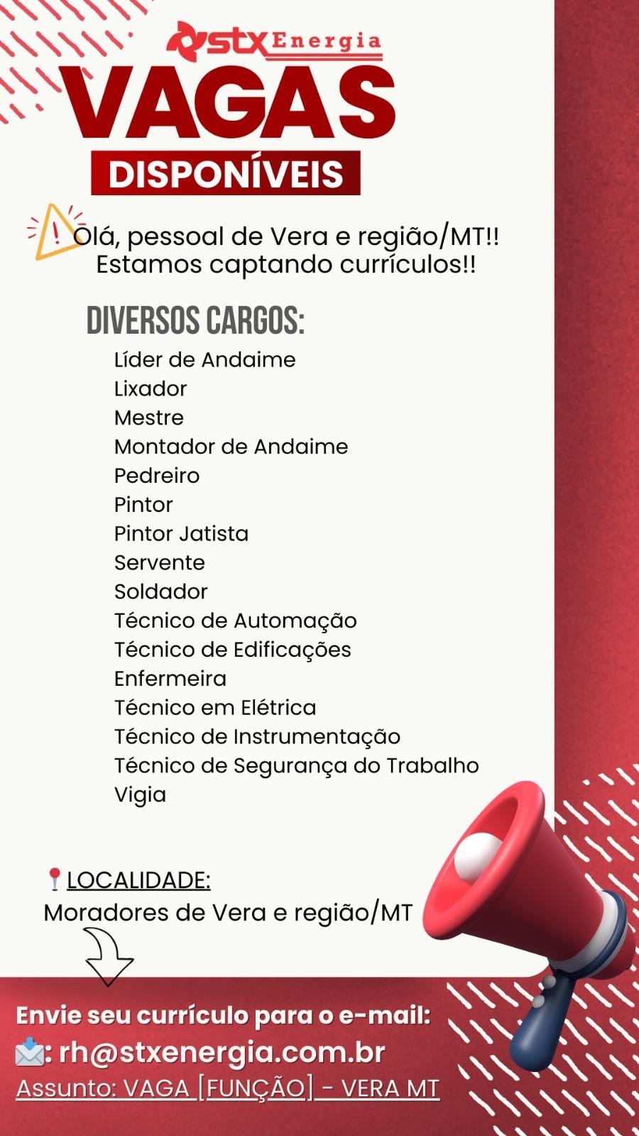 Embora as datas exatas para o início das contratações ainda não tenham sido definidas, a empresa reforça que a prioridade absoluta é para os moradores de Vera e região.