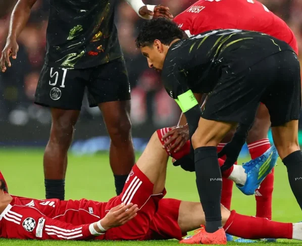 O jogador de 23 anos indicou dores na região do tendão de Aquiles enquanto recebia atendimento médico em campo, antes de ser retirado de maca em Anfield.