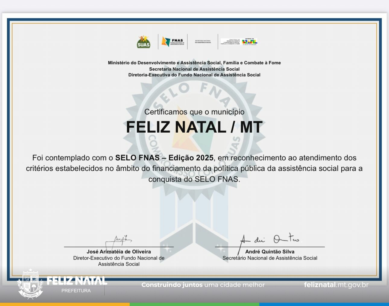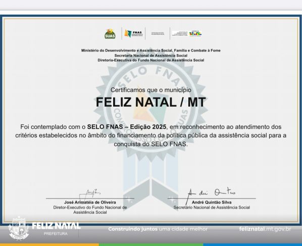 O município de Feliz Natal alcançou um importante reconhecimento na área da Assistência Social ao conquistar o Selo FNAS 2025 – Excelência e Transparência na Gestão do SUAS. A certificação é concedida pelo Fundo Nacional de Assistência Social (FNAS) aos municípios que se destacam pela gestão responsável, eficiente e transparente dos recursos públicos destinados à política de assistência social.