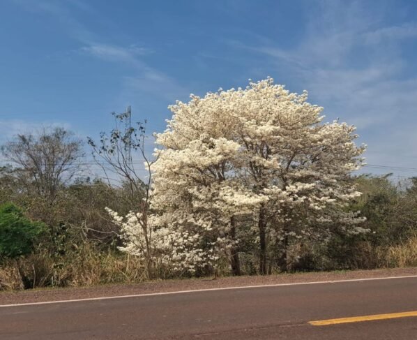 Ipês-brancos florescem e encantam motoristas neste domingo (7) na BR-262, em Miranda, a 190 km de Campo Grande. A florada enfeitou a paisagem e deu um verdadeiro show de beleza no coração do Pantanal.
