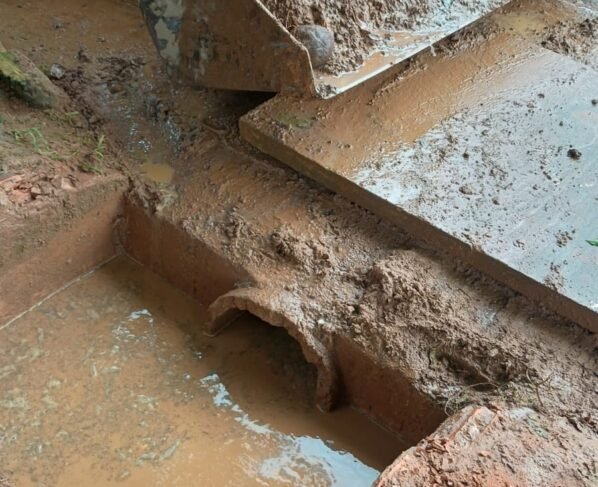 Em alguns trechos, foi necessário retirar um grande volume de material sólido que impedia o fluxo normal da drenagem e comprometia o funcionamento do sistema.