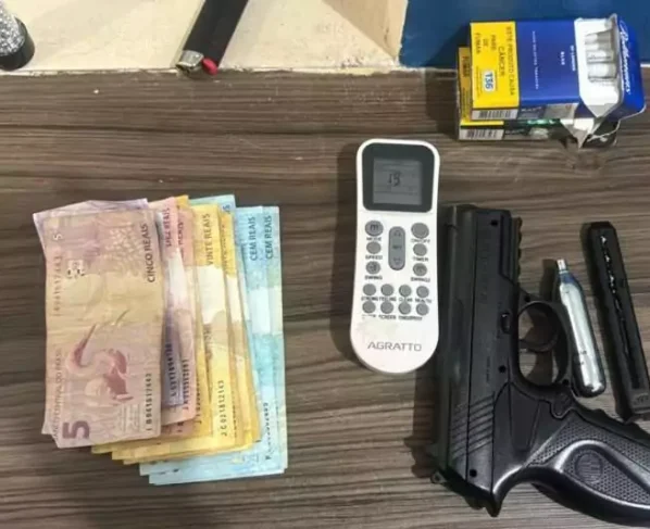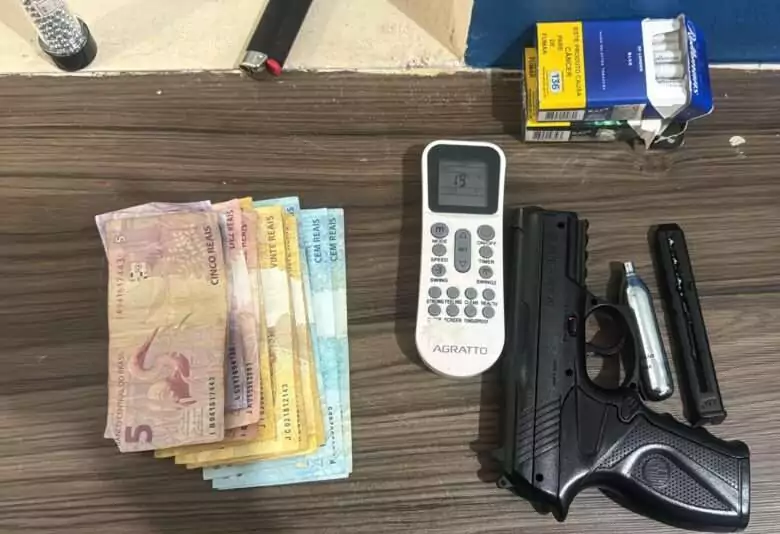 A equipe se dirigiu ao hotel indicado e localizou o suspeito em um dos quartos. Durante a revista, os agentes encontraram um simulacro de arma de fogo, uma porção de esferas de aço e aproximadamente R$ 550 em dinheiro.