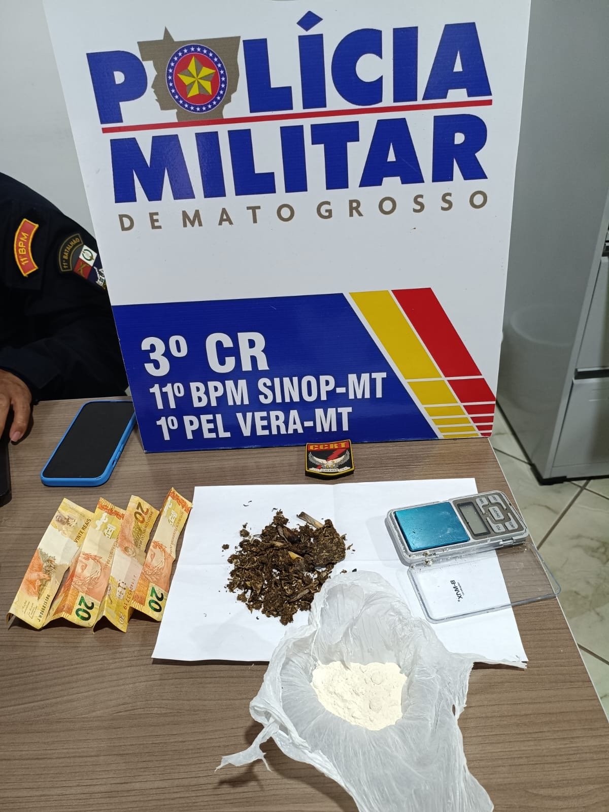 Na sequência, os militares deram continuidade às diligências e localizaram com o suspeito uma balança de precisão, a quantia de R$ 80,00 em dinheiro e uma quantidade significativa de substância semelhante à pasta base de cocaína. Os materiais apreendidos são considerados indícios característicos da prática de tráfico de entorpecentes.