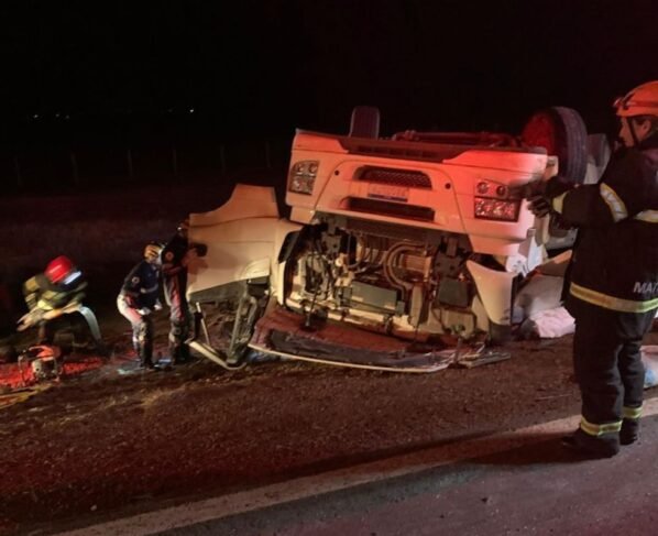 Conforme a Polícia Civil, uma equipe foi acionada às 2h, informada de acidente em que uma carreta carregada de farinha de trigo, saiu da pista e capotou.