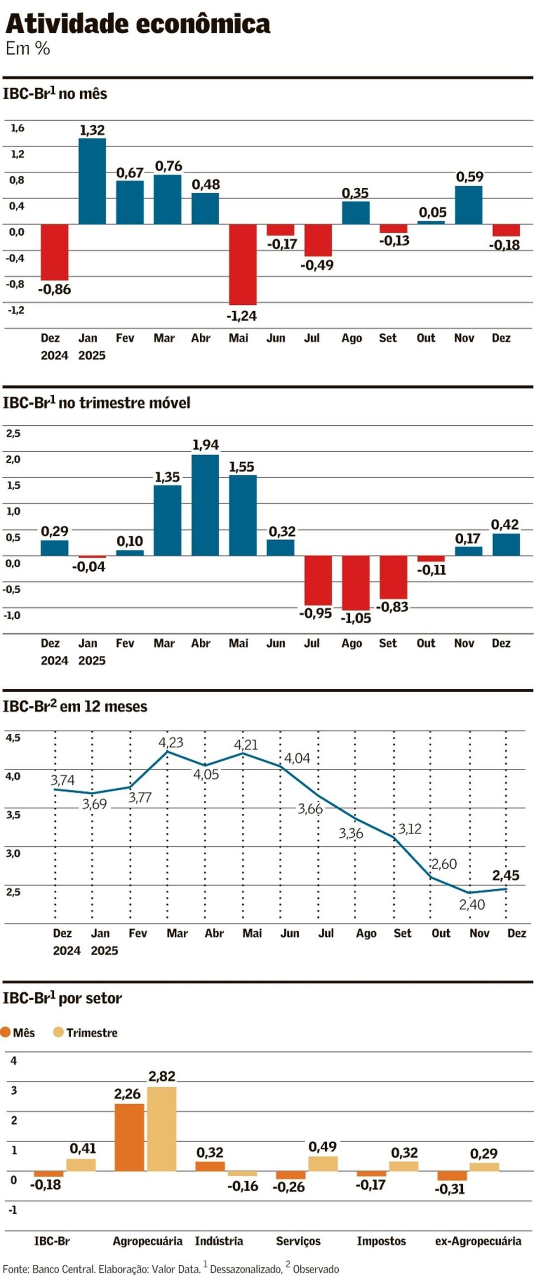 O Índice de Atividade Econômica do Banco Central (IBC-Br) caiu 0,18% em dezembro ante novembro, mas terminou 2025 com crescimento de 2,45%, conforme divulgou ontem a autoridade monetária brasileira. Os dados vieram acima da mediana das expectativas coletadas pelo Valor Data, que indicavam queda mensal de 0,5% e alta de 2,40% no acumulado do ano.