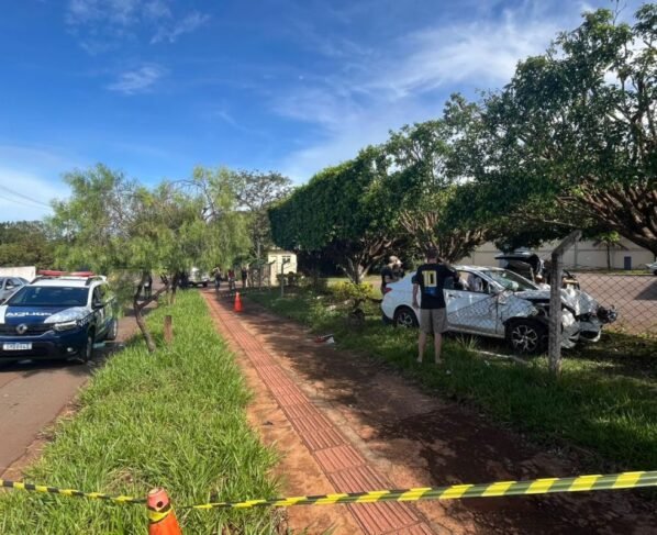 Duas pessoas estavam no carro, que, após o condutor perder o controle, invadiu a calçada, derrubou uma cerca e atingiu uma árvore. O motorista foi socorrido, mas morreu no local. Já a passageira, esposa dele, reclamava de dores e foi atendida sem ferimentos graves.