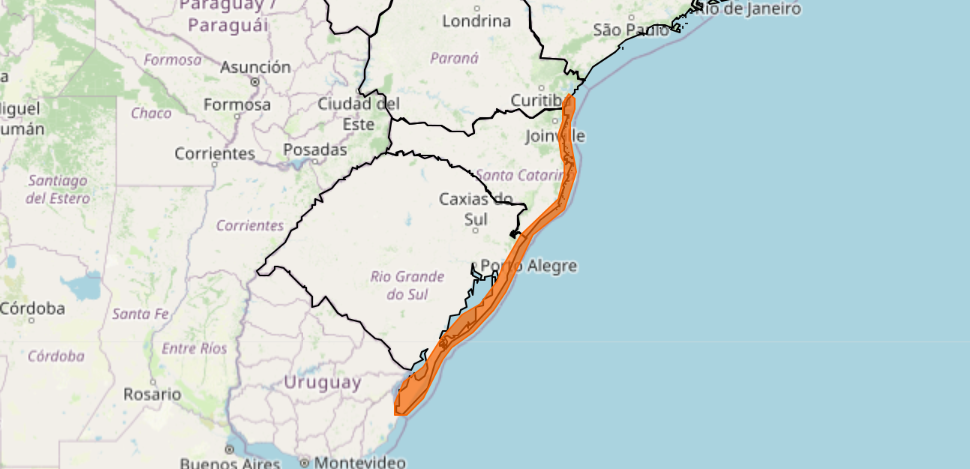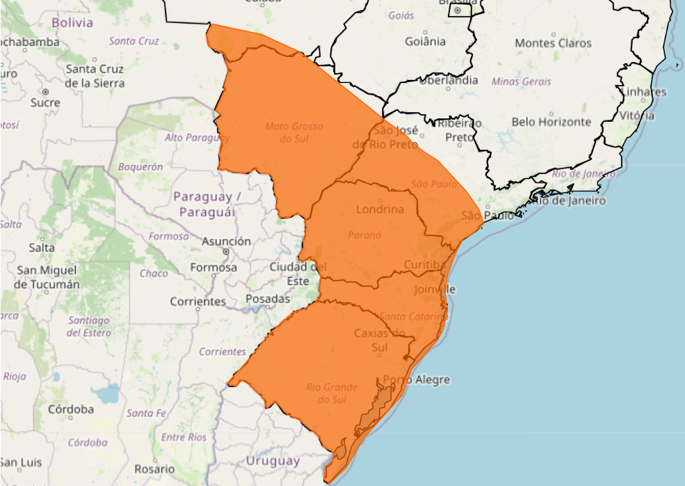 Um dos alertas é para grande perigo de tempestade em áreas do Rio Grande do Sul, Santa Catarina, Paraná e sul de Mato Grosso no Sul. Nessas áreas (veja quadro abaixo), a expectativa é de chuva superior a 60 mm/h ou maior que 100 mm/dia, ventos superiores a 100 km/h, e queda de granizo. O alerta é válido deste domingo (16) até as 3h da segunda-feira (17).
