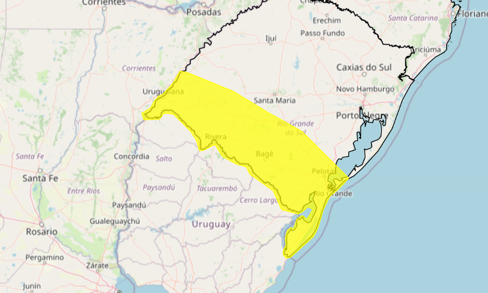 Um alerta de perigo potencial por queda de temperatura indica que pode haver declínio de 3 a 5 ºC até as 9h da segunda-feira numa faixa do Rio Grande do Sul que abarca o sudoeste, o sudeste e áreas do centro do estado (veja abaixo).