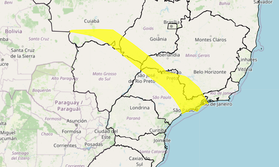 Um perigo potencial de tempestades atinge uma estreita faixa que engloba áreas de seis estados, de São Paulo a Mato Grosso, onde a chuva pode ficar entre 20 e 30 mm/h ou até 50 mm/dia, com ventos intensos (40-60 km/h) e queda de granizo.