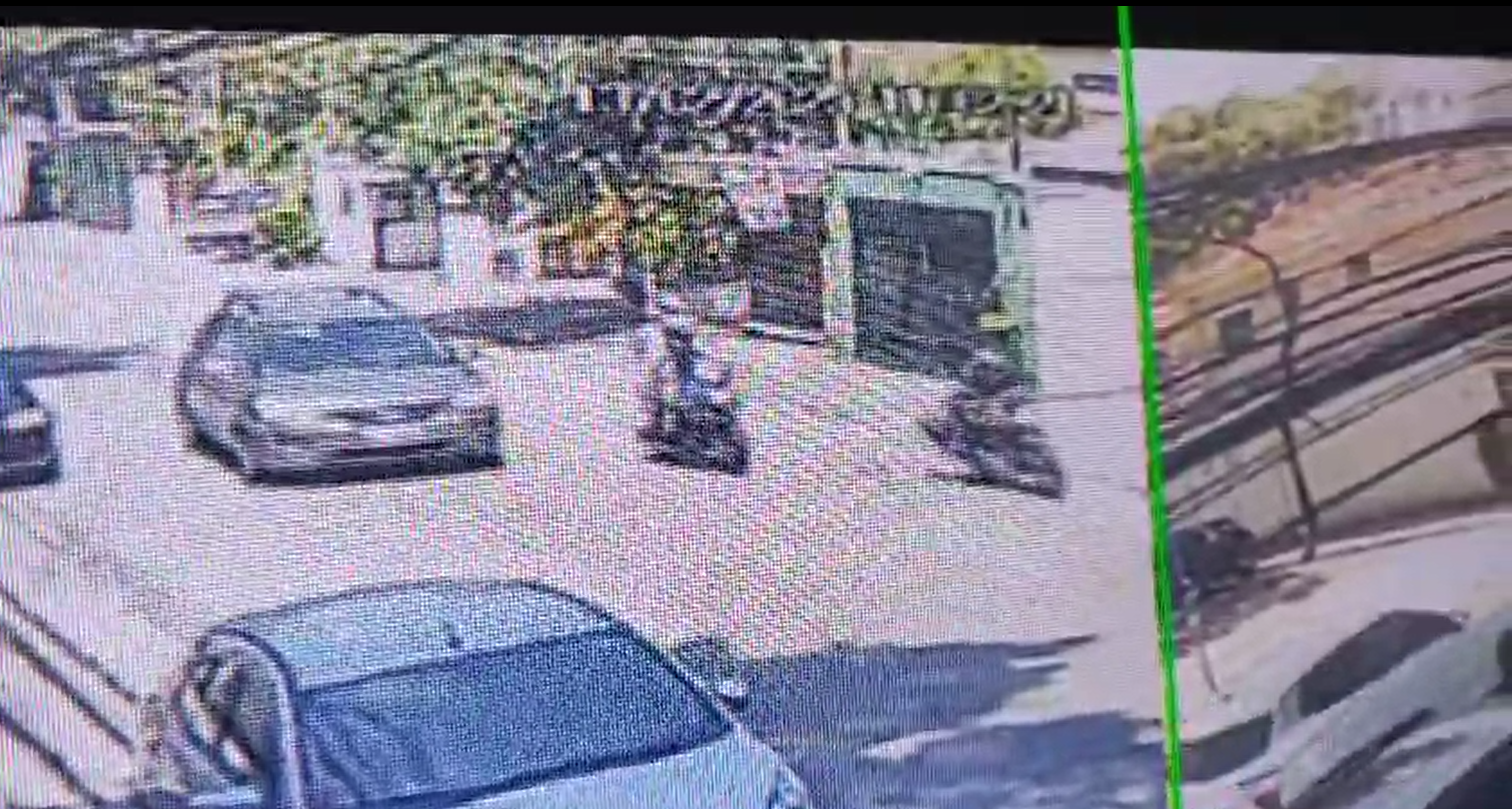 Câmeras de segurança registraram o momento em que é possível ver que dois homens em uma moto abordam a vítima, que aparentemente estava saindo de algum estabelecimento.