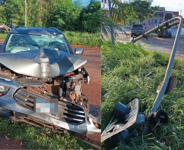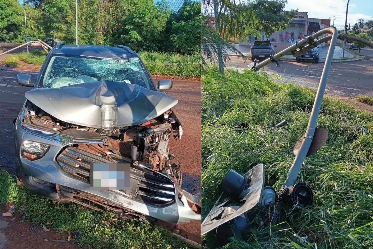 Motorista não identificado perdeu o controle da direção e bateu a caminhonete que conduzia, em um semáforo localizado no cruzamento da rua Ezequiel Ferreira Lima com a Avenida Vereador Thyrson de Almeida, no bairro Aero Rancho, em Campo Grande. O caso ocorreu na manhã deste domingo (5).