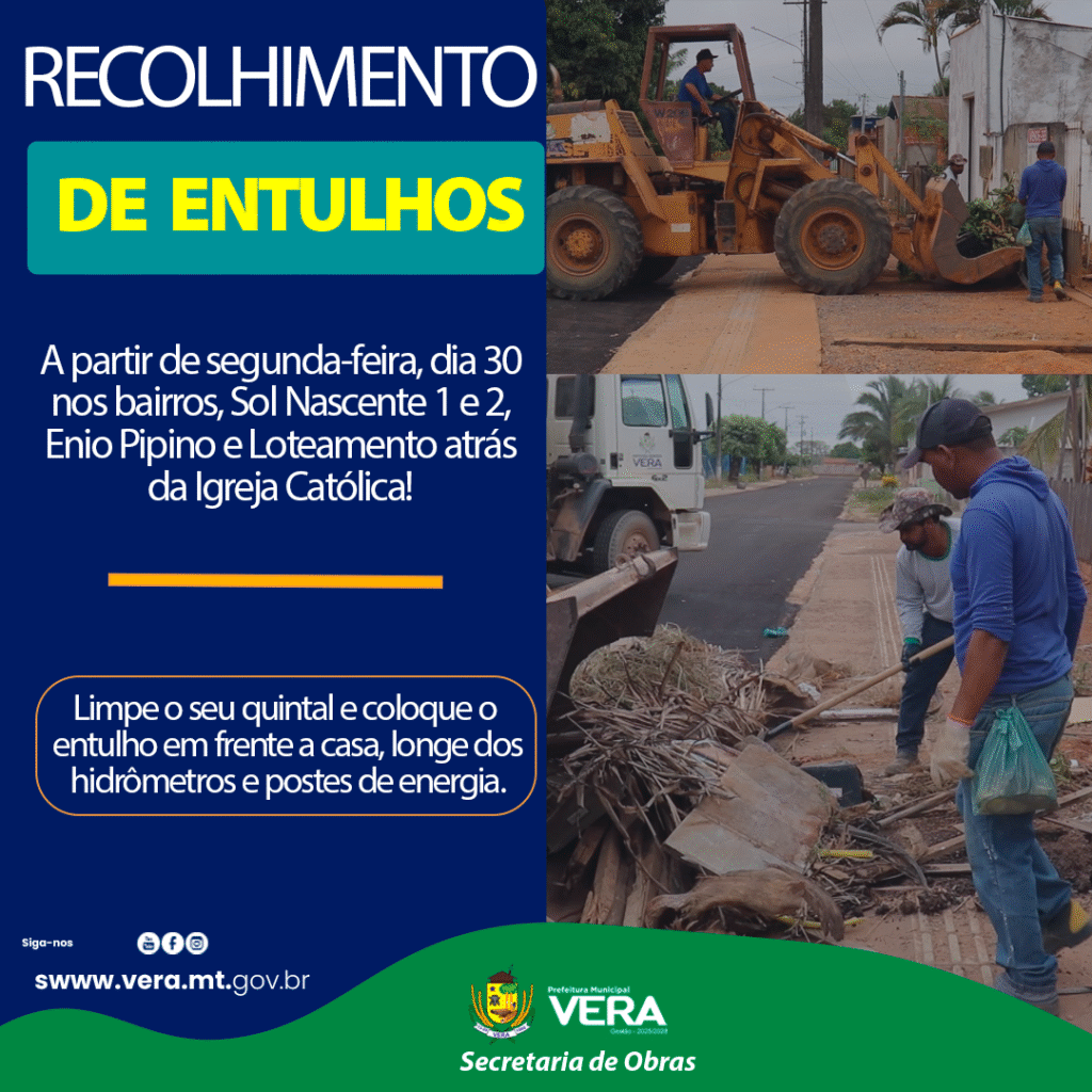 A Secretaria de Obras, Transportes e Serviços Urbanos de Vera inicia, na próxima segunda-feira (30), mais uma etapa da campanha de recolhimento de entulhos nos bairros da cidade e na região central. Com a chegada do período de estiagem, a ação reforça a importância da limpeza urbana como medida de prevenção contra focos de incêndio e a proliferação de vetores, como o mosquito da dengue.