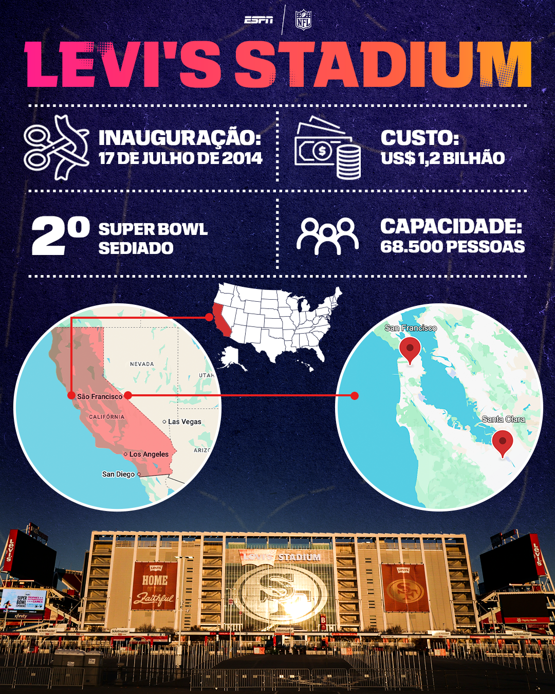 Apesar de ser a casa do San Francisco 49ers, o estádio fica na cidade de Santa Clara, na Califórnia. É como se o São Paulo deixasse o Morumbis para mandar seus jogos em Jundiaí, no interior paulista.