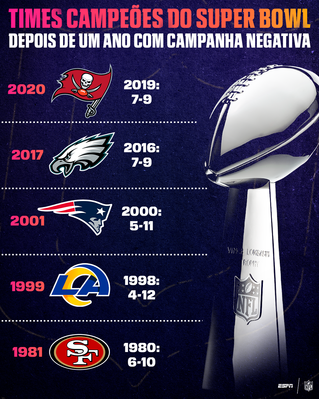 Os Patriots já haviam conseguido esse feito outras duas vezes: alcançando o Super Bowl em 1996, depois de um retrospecto de 6–10 no ano anterior, e novamente em 2001, um ano após fechar a temporada com campanha de 5–11. Na primeira oportunidade, foram derrotados pelo Green Bay Packers. Na segunda, Tom Brady levou os Pats ao primeiro título da liga contra o St. Louis Rams.