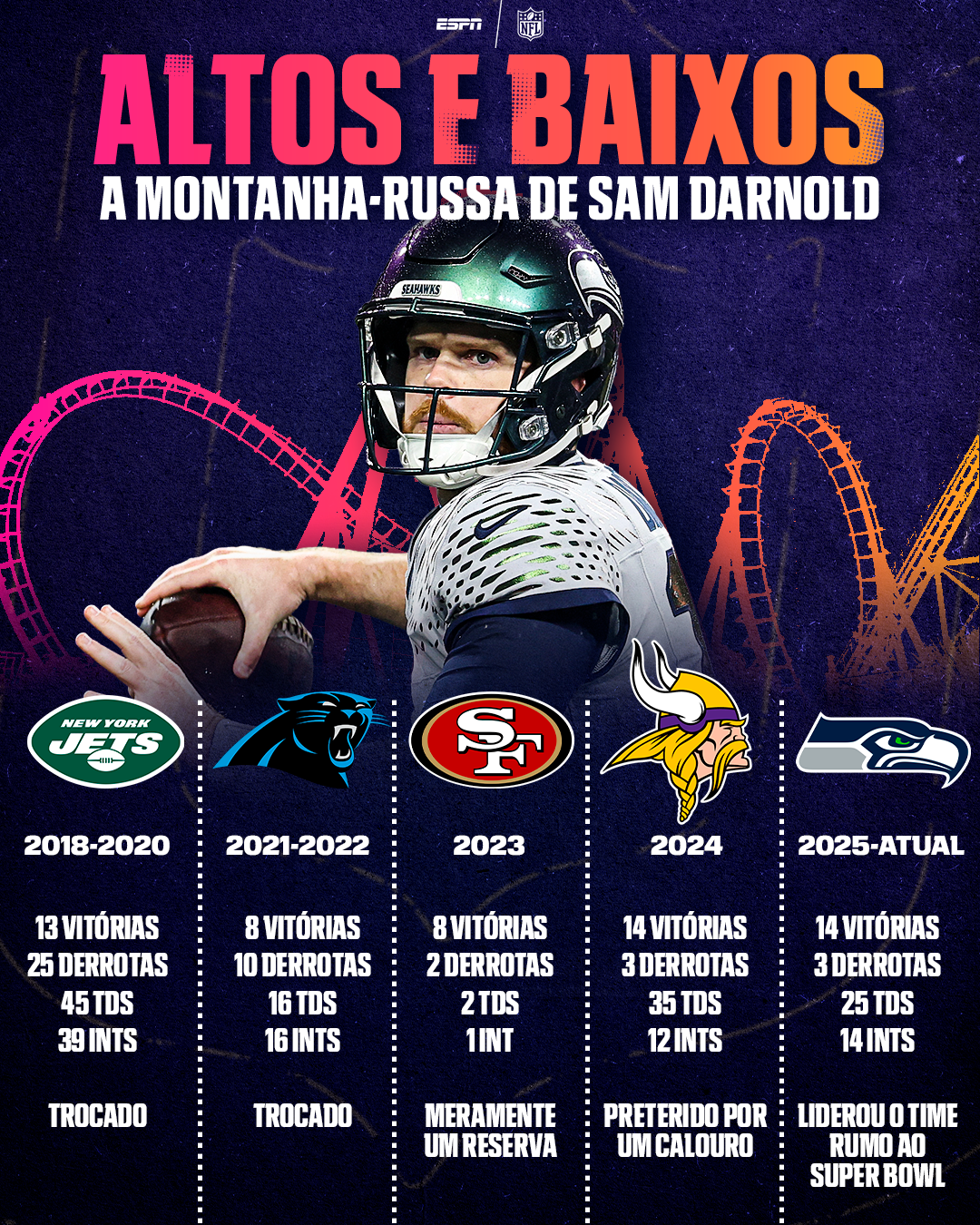 De descartado ao Super Bowl. Em seu quinto time, após quase oito anos e 3 mil tentativas de passes, Sam Darnold vive seu grande momento na carreira.