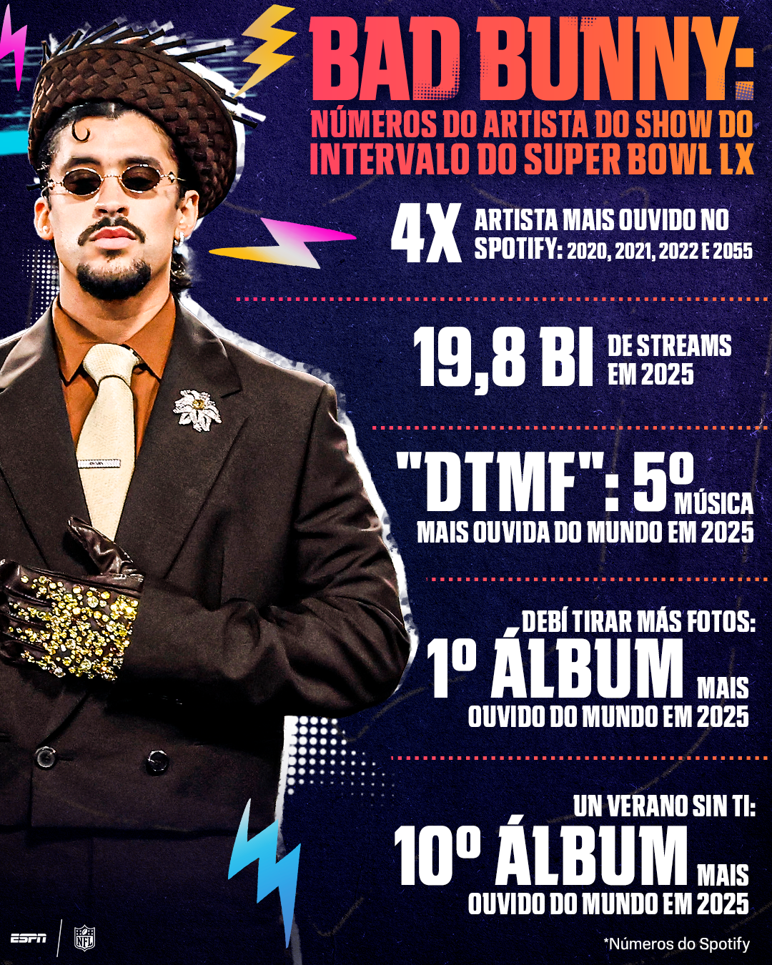 Mesmo em um ano de Copa do Mundo, a final da NFL é certamente um dos eventos esportivos de maior impacto. E isso acontece justamente porque existem diversos fatores que vão além dos quatro quartos da partida. Um exemplo é o show de Bad Bunny, artista mais ouvido no Spotify em 2025.