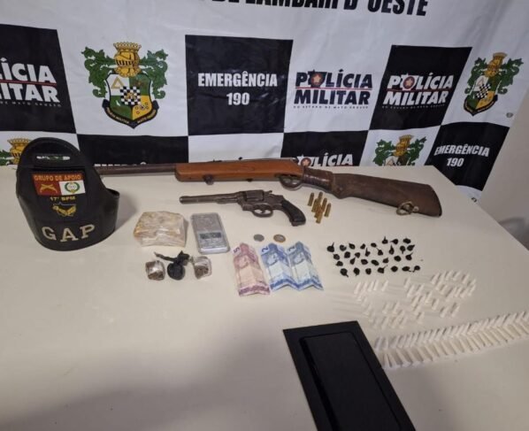 Policiais militares do 17º Batalhão prenderam um homem, por porte ilegal de arma de fogo e tráfico ilícito de drogas, nesta segunda-feira (16.2), em Lambari D’Oeste. Com o suspeito, foram apreendidas 119 porções de drogas entre cocaína, maconha e pasta base, além de um fuzil, um revólver e sete munições de calibre .38.