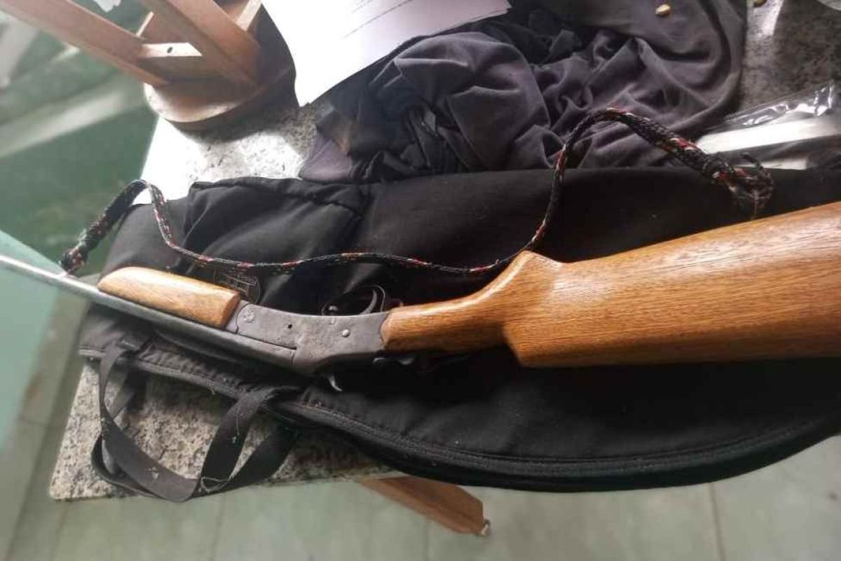 Dentro da residência, os policiais localizaram uma espingarda de calibre 36, que estava no quarto do casal. O investigado confirmou que a arma estava sob sua responsabilidade e foi deixada por seu pai, que já faleceu.