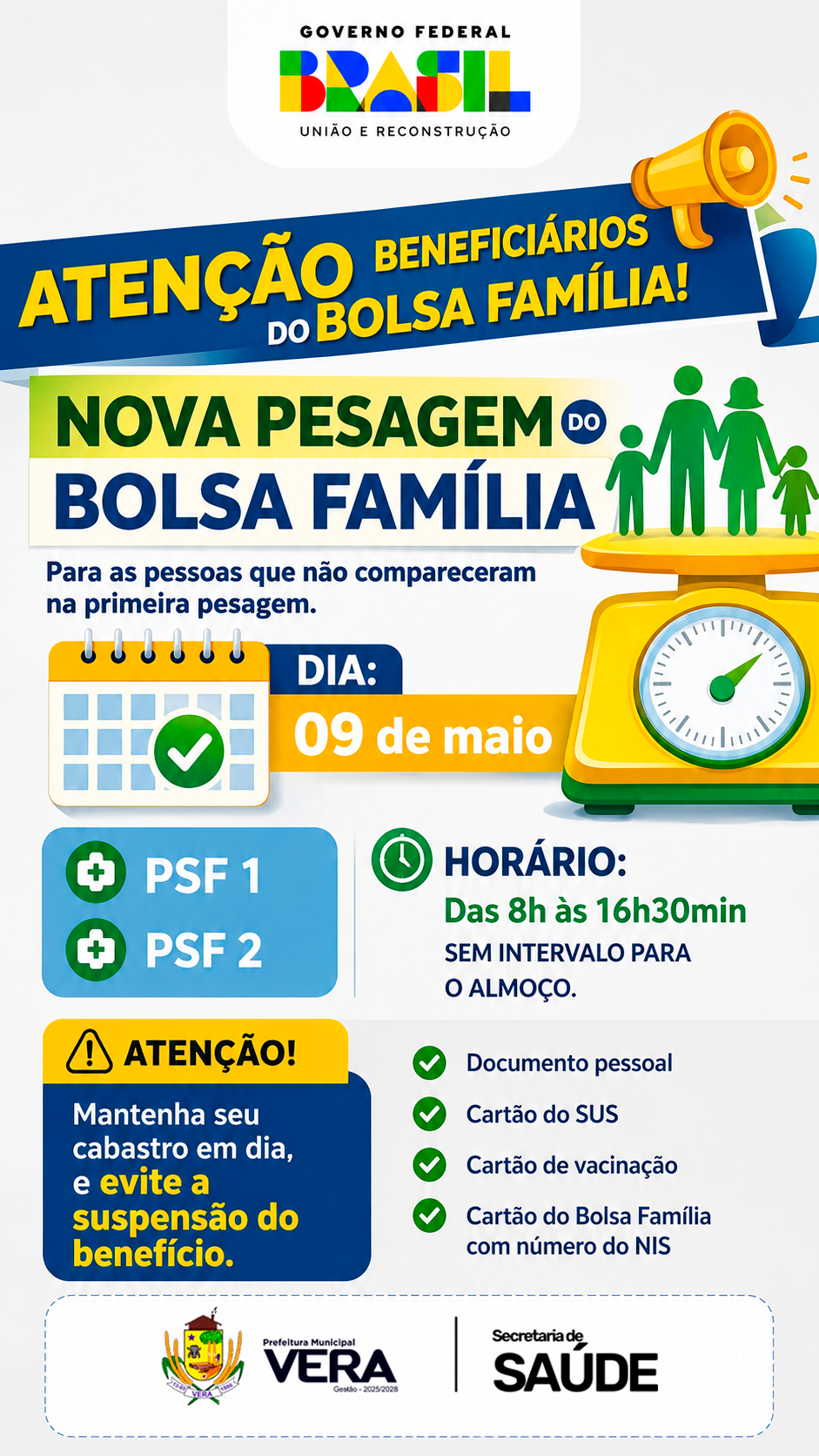 A Prefeitura de Vera, por meio da Secretaria Municipal de Saúde, está convocando os beneficiários do programa Bolsa Família que ainda não realizaram a pesagem obrigatória. A nova etapa será realizada no dia 9 de maio, com atendimento nos PSF 1 e PSF 2, das 8h às 16h30, sem intervalo para o almoço.