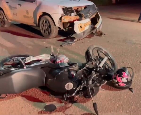 A versão apurada é de que a motocicleta estava na preferencial e foi “cortada” pelo carro que não parou no cruzamento. A parte frontal do veículo ficou com danos significativos.