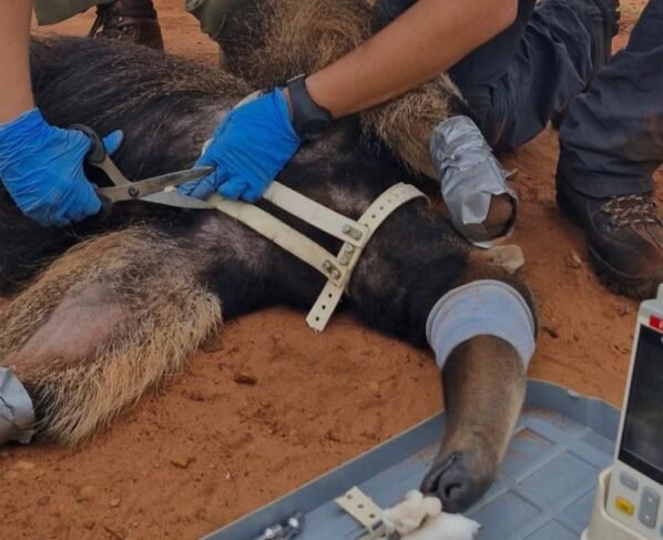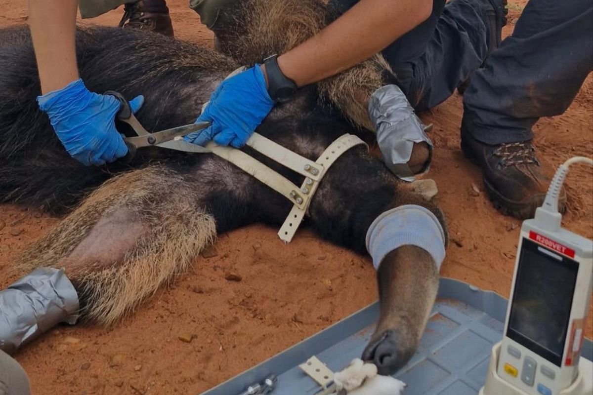 Mais um tamanduá-bandeira recebeu colete para rastreamento e monitoração da saúde, desenvolvido por pesquisadores do projeto Bandeiras e Rodovias, em Mato Grosso do Sul. Os animais analisados recebem o equipamento que se ajusta ao corpo.