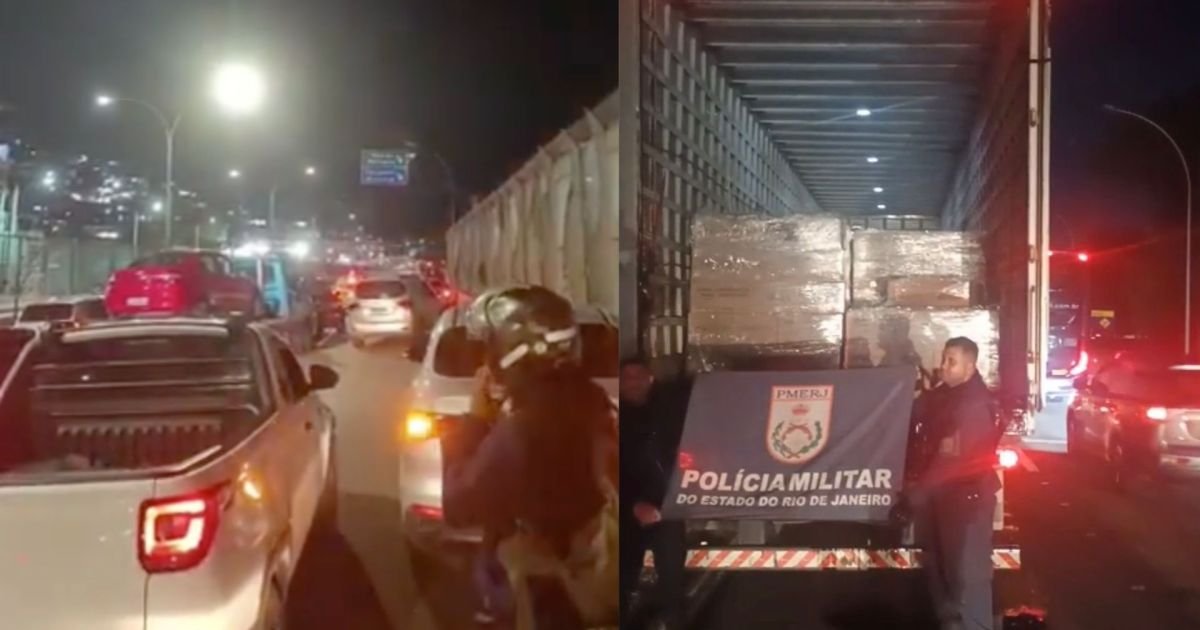 De acordo com a Polícia Militar, agentes recuperaram uma carreta roubada que transportava óleo lubrificante em um dos acessos à comunidade.